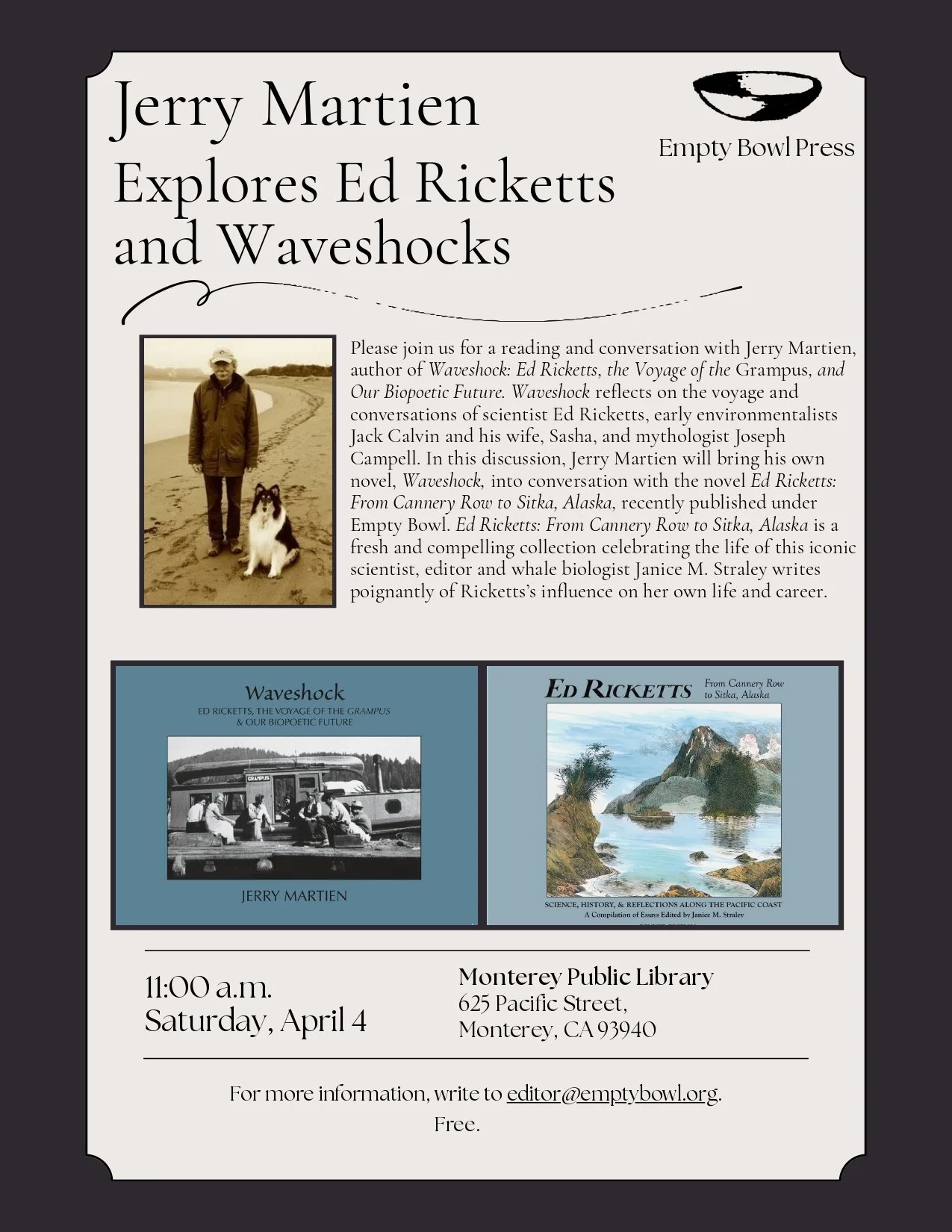 Please join us for a reading and conversation with Jerry Martien, author of Waveshock: Ed Ricketts, the Voyage of the Grampus, and Our Biopoetic Future, beginning at 11:00 a.m. at the Monterey Public Library, on Saturday, April 4. In this discussion, Jerry Martien will bring his own novel, Waveshock, into conversation with the novel Ed Ricketts: From Cannery Row to Sitka, Alaska, recently published under Empty Bowl.