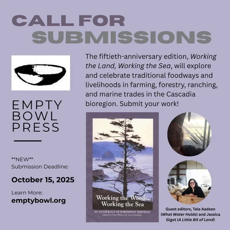 As we announced in our recent newsletter, in 2026, as part of the celebration of Empty Bowl’s fiftieth year of operation, we’ll be publishing Working the Land, Working the Sea. This anthology will explore and celebrate traditional foodways and livelihoods in farming, forestry, ranching, and marine trades in the Cascadia bioregion. We’re happy to announce that the anthology’s editors will be Tele Aadsen and Jessica Gigot. We’re looking for submissions from those who tend, gather, farm, fish, ranch, research, or work in managed landscapes, restoration, or in a variety of occupations at sea. We’ll be accepting submissions through Submittable. You can also find details on our website. The deadline for submissions is September 1, 2025.