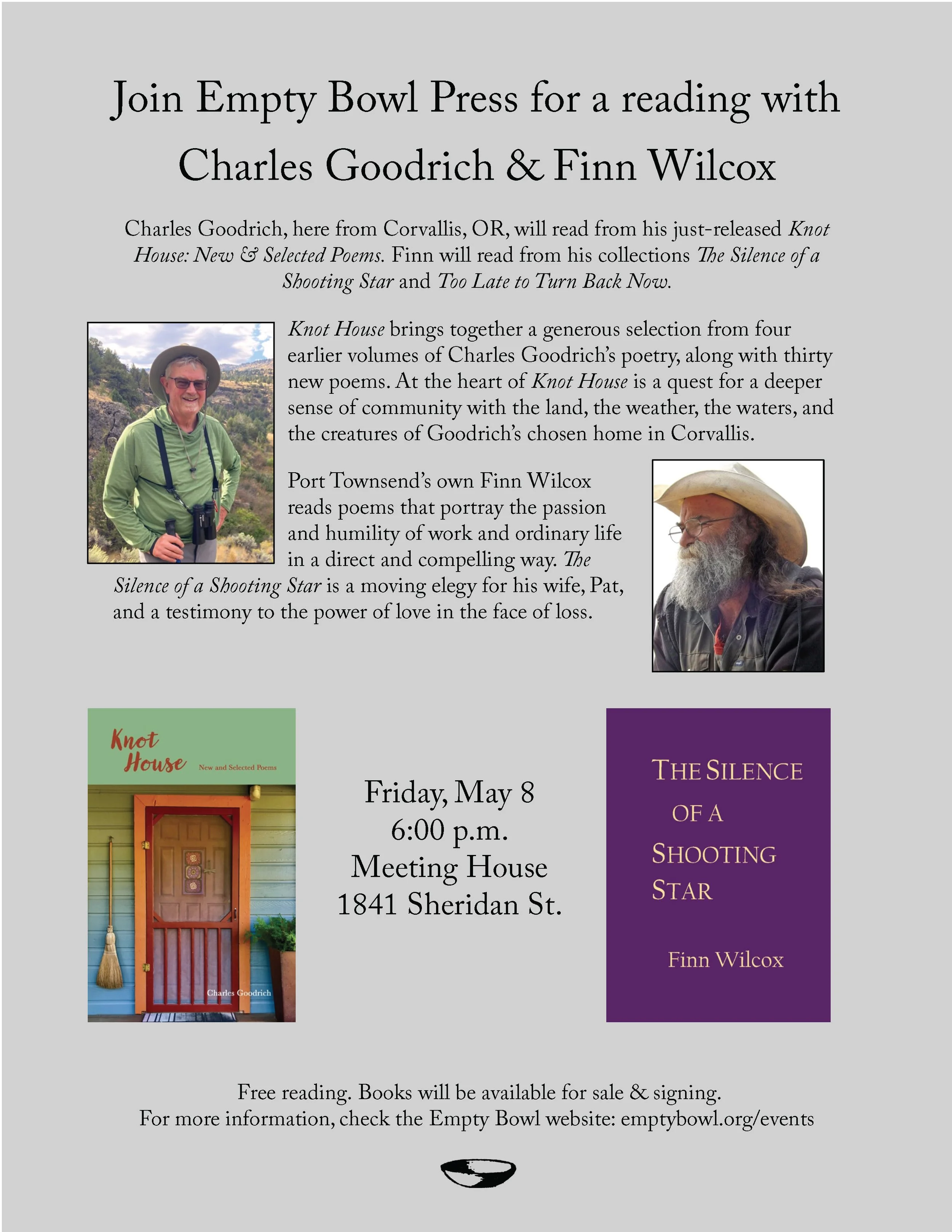 Charles Goodrich’s Knot House launched last week in Corvallis to an appreciative crowd of more than 100! Thanks again to the Spring Creek Project for hosting this reading. Charles will be reading in Port Townsend on May 8 at 6 p.m. at the Meeting House, teaming up with long-time Empty Bowl poet Finn Wilcox, who will be reading from The Silence of a Shooting Star and Too Late to Turn Back Now. Details below and on our website.